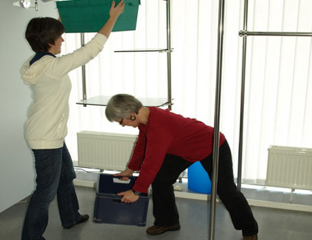 Heben und Absetzen einer Kiste mit Gewichten in verschiedenen Richtungen (auch als PILE-Test), zur Prävention und Therapie von Rückenschmerzen.